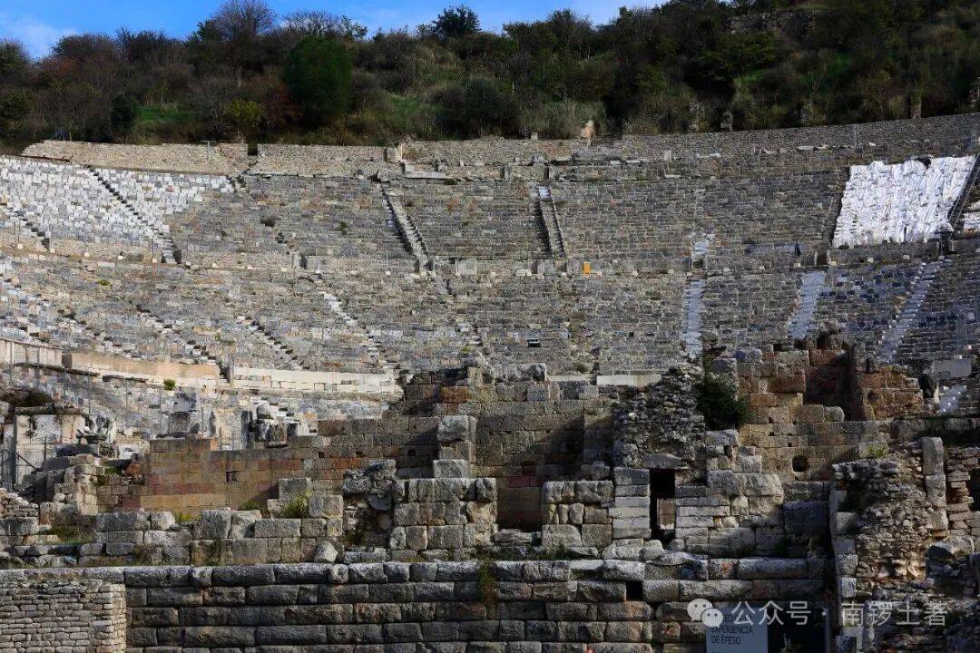 再往前走,右手边突然展现出一片扇形的石砌海洋,这就是古代世界上最大的剧场之一,能容纳2.5万人的以弗所大剧场。以弗所大剧场始建于公元前3世纪的古希腊时期,后在罗马帝国统治时期,即公元41 年到公元117年间进行了大规模的改造和扩建,使其规模和设施更加完善。