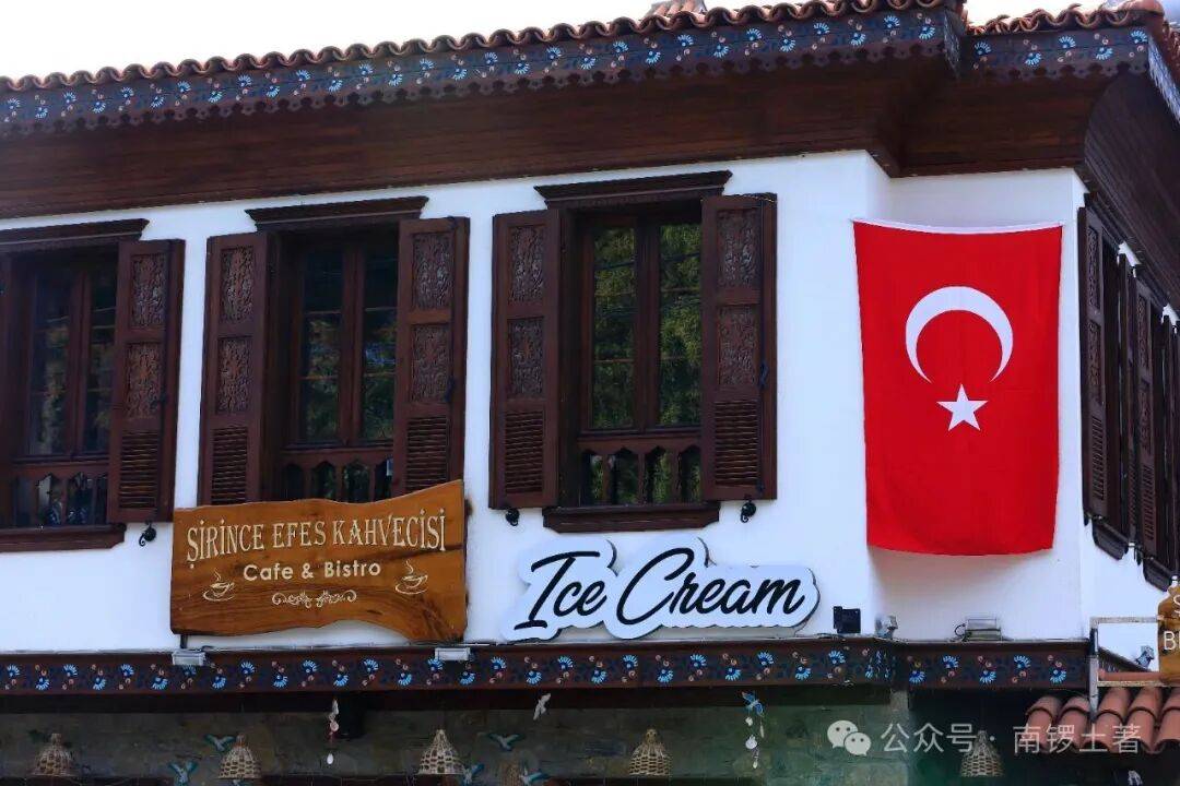 临近正午,主街的面包店飘出刚出炉的芝麻面包香,还有随处可见的土耳其花式冰激凌店,小伙子一边吆喝一边慢悠悠地转着冰淇淋勺,哪怕没有客人,也依旧保持着优雅的节奏,仿佛在与这缓慢的时光共舞。不时有好奇的游客和小孩,会驻足等着杂耍一般的冰激凌小伙儿手里的甜筒。在满街的阳光里,看见街对面的教堂尖顶~浅褐色的砖石叠出精致的纹路,顶端的十字架在阳光下泛着柔和的光,像一位沉默的守望者,静静立在小镇的烟火气里。