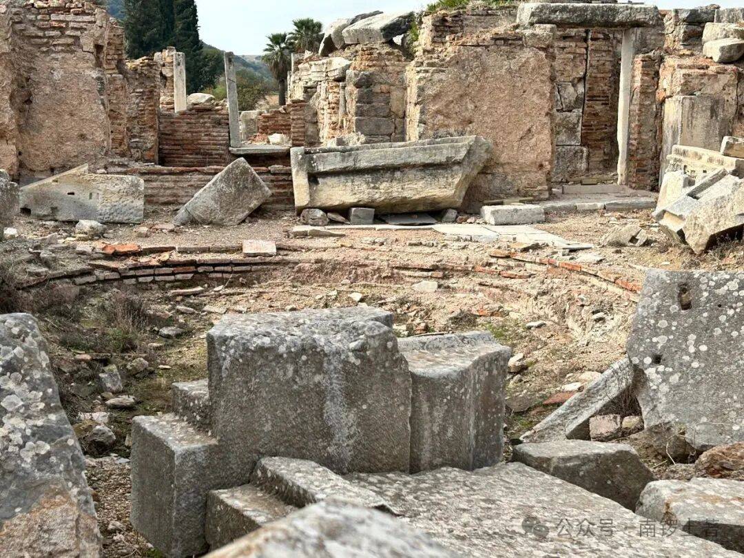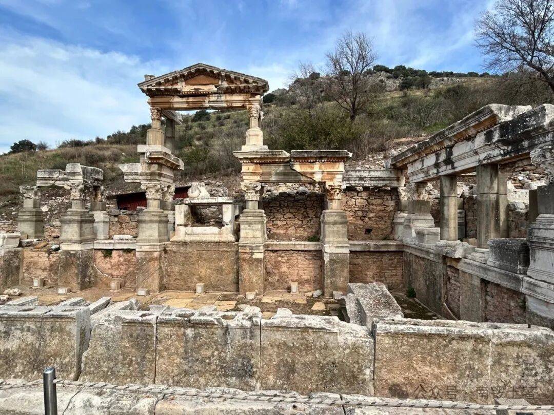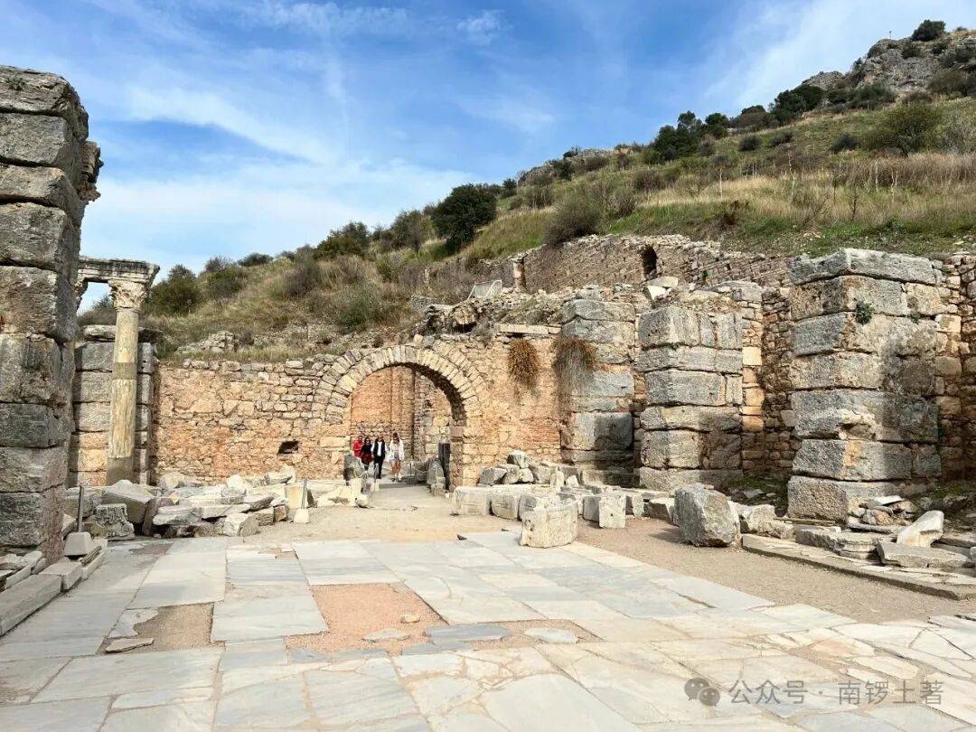 以弗所遗址在山坡上,山上山下都有出入口。我们的导游安排我们从山上入口进,这样一路向下参观游览,不累。从山上入口进来,就是瓦利乌斯浴场(Baths of Varius),罗马城市的三大件之一。浴场虽破败,却藏着最生动的生活印记。