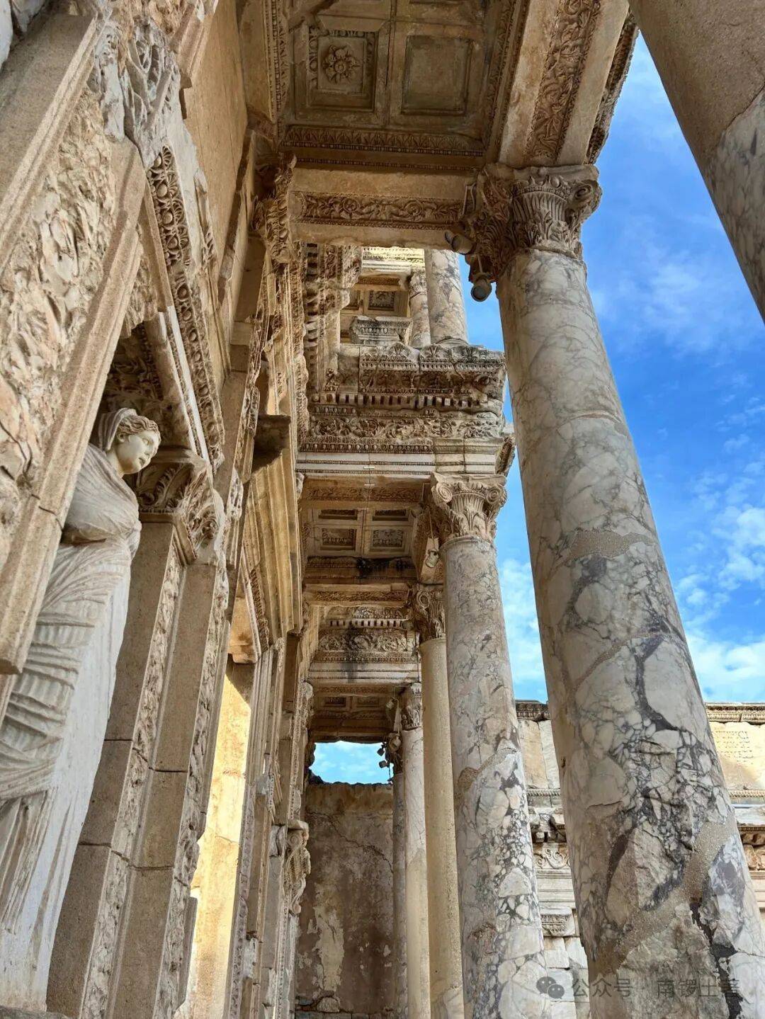 午后的阳光从外立面的柱廊间隙中洒下,16米高的爱奥尼克石柱撑起残缺的拱券,九级台阶的每一级都承载着2000年的喧嚣。我沿着台阶坐下,想象当年1.2万册莎草纸卷在此呼吸的模样。图书馆面向东方的三扇窗棂依旧朝着日出的方向,就像古籍中记载的那样,晨光会先照亮“智慧”、“学识”女神的面容。不远处,一位老者用素描本勾勒着柱式的细节,铅笔划过纸面的沙沙声,与两千年前抄书吏的鹅毛笔尖声奇妙地产生了共鸣。地下通道的入口被玻璃罩保护着,传说当年学者们就是从这里悄悄去往对面的妓院,如今倒成了孩子们捉迷藏的好去处。