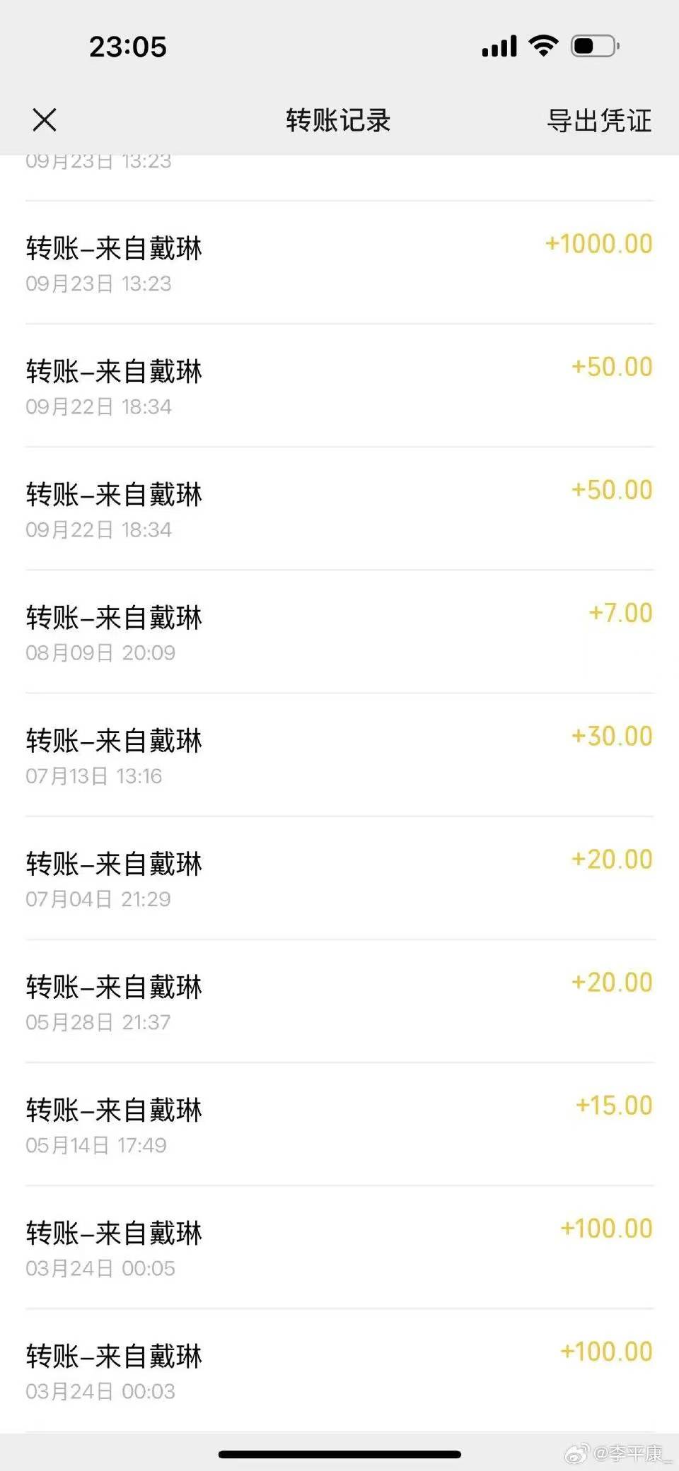 这名球迷向李平康提供了自己的病历、诊断书、戴琳本人签字的7万块钱欠条以及两人之间的部分聊天记录。随后,李平康在微博上将此事以不点名的方式曝光,戴琳注意到该微博后,随即联系上欠钱的球迷,许诺如果删除微博就会还钱。李平康表示秉着帮助人的态度,在球迷的要求下他暂时将当时的微博删除,戴琳也确实还了一部分钱。