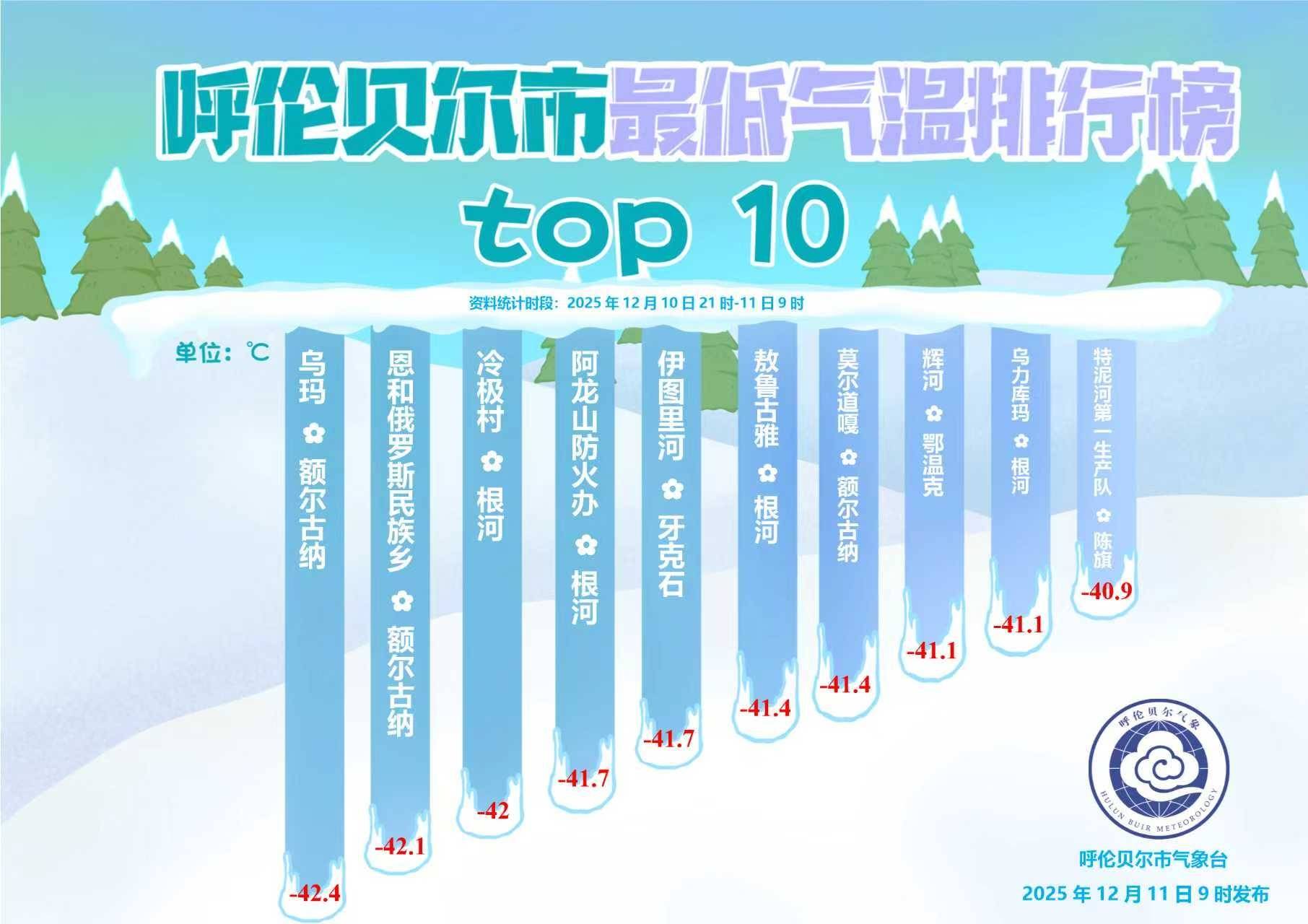 记者从内蒙古呼伦贝尔市气象局获悉,受本轮寒潮天气影响,12月11日凌晨,极寒天气在呼伦贝尔北部多地再度现身,全市18个气象监测站最低气温跌破零下40℃。