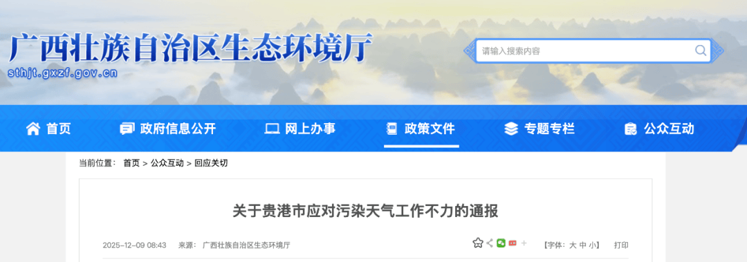 12月8日、11日,广西壮族自治区生态环境厅分别发布《关于贵港市应对污染天气工作不力的通报》和《关于桂林市应对污染天气工作不力的通报》。