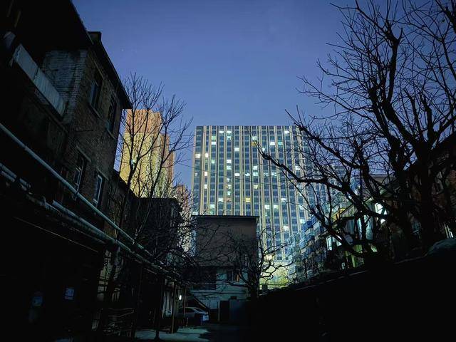 夜色铺开,低矮的老旧住宅人影罕见,而马路对面的写字楼依然灯火通明。