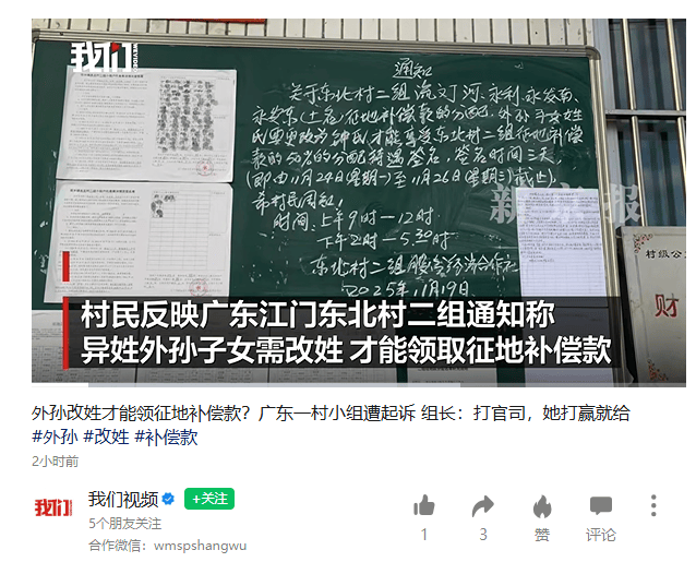 12月10日,村民反映广东江门东北村二组通知异姓外孙子女需改姓才能领取征地补偿款。