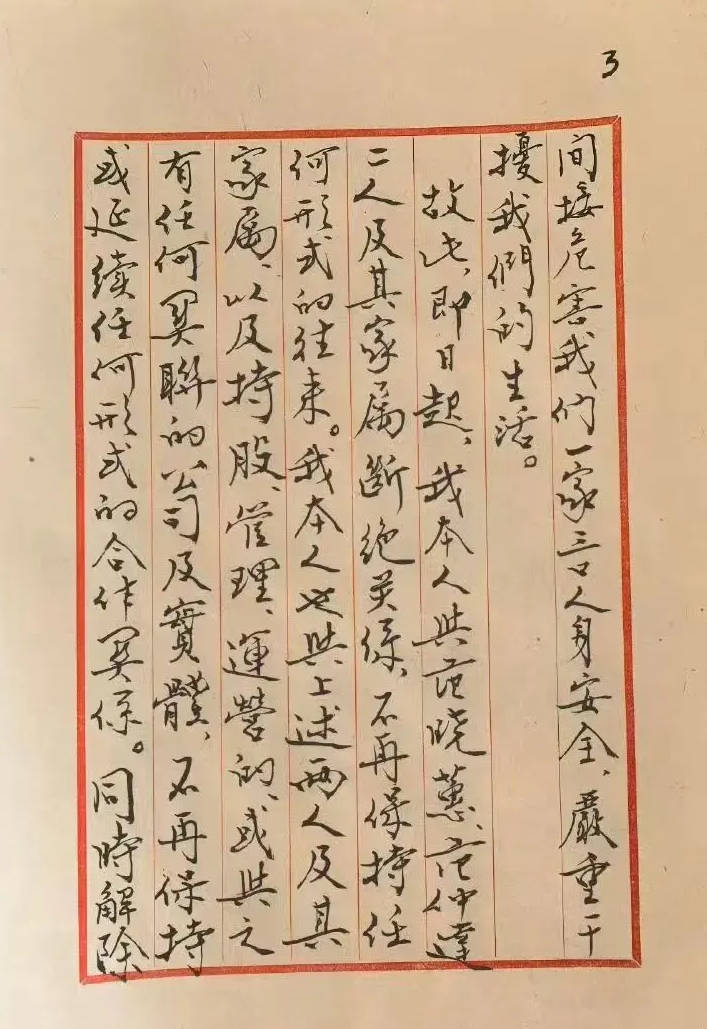 故此,即日起,我本人与范晓蕙、范仲达二人及其家属断绝关系,不再保持任何形式的往来。我本人也与上述两人及其家属、以及持股、管理、运营的,或与之有任何关联的公司及实体,不再保持或延续任何形式的合作关系。同时解除并撤销对上述两人及其家属、其所涉及实体的任何委托、授权或其他合同关系。上述人员及实体不得再以我的名义对外从事任何活动。上述人员及其实体的任何活动也均与我本人无关。对其在销售、展览、赠与或其他任何活动中涉及到我本人名义的艺术作品,我个人均不予置评,但保留追究其法律责任的权利。