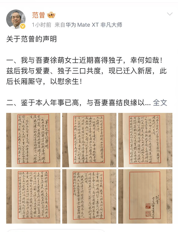 事实上,对于儿子的出生,87岁的范曾在12月11日的声明中难掩喜悦,称“幸何如哉”,并强调未来将与爱妻、幼子“三口共度”。这一全新核心家庭的形成,必然引发其对身后事——包括情感寄托、财产继承与事业传承——的全面重新规划,原有的、关系复杂的子女(亲生女儿与继子)在新的家庭结构中被边缘化或被抛弃。