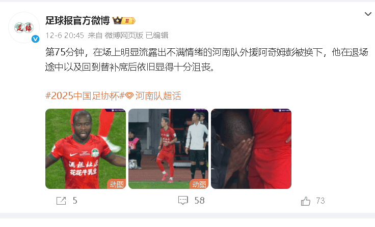 2025年足协杯决赛,北京国安对阵河南队的赛场上,当主教练挥手示意换人时,32岁的阿奇姆彭猛然摘下队长袖标,狠狠摔在替补席上。他红着眼眶冲向场边,嘴里不停嘟囔着什么,甚至一度蹲在地上,双手捂脸,这是为什么?难道他不想下场?难道他想帮助球队夺得冠军吗?