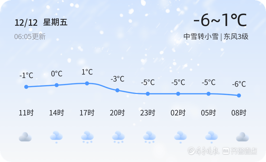 今天是12月12日,星期五,农历十月廿三。泰安市迎来大雪天气,中雪转小雪,气温介于-6℃至1℃之间。东风3级,空气湿度62%,PM2.5指数36,空气质量良好。全市各区均出现降雪,道路湿滑,市民出行需注意安全。