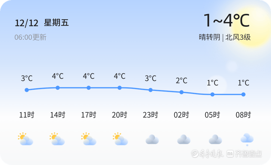 今天是12月12日,农历十月廿三,星期五。青岛市迎来了一天的晴转阴天气,全市大部分地区气温较低,最高气温4℃,最低气温1℃。目前青岛市的实时温度为-2℃,伴有北风3级,空气湿度为66%,PM2.5指数为21,空气质量良好。各区天气情况基本一致,均为晴转阴,市民出行需注意防寒保暖。