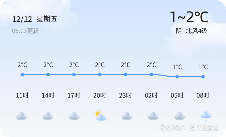 今天是12月12日,星期五,农历十月廿三。烟台市今日天气阴,北风4级,当前温度为-0.9℃,空气质量指数为20,属于优级,市民可以放心出行。今日最高温度为2℃,最低温度为1℃,由于风力较大,市民出行时需注意防风保暖,建议佩戴围巾和帽子,以免受凉。此外,湿度为61%,体感温度较低,建议市民穿着厚实的防风衣物。