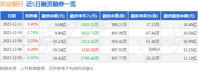 证券之星消息,截至2025年12月11日收盘,农业银行(601288)报收于7.93元,上涨1.41%,换手率0.09%,成交量278.86万手,成交额21.72亿元。