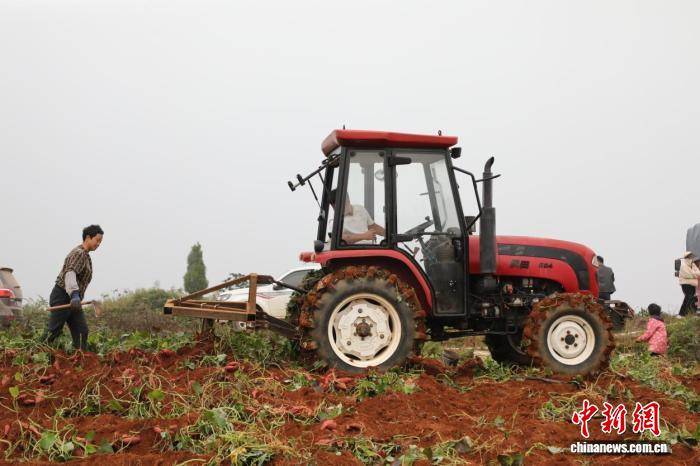 中新网永州12月12日电 (周林凤 李月娟)在湖南新田县石羊镇清水湾村耀农专业合作社金鸡岭种植基地,红薯收割机轰鸣穿梭,一个个色泽红润、体态饱满的红薯破土而出。
