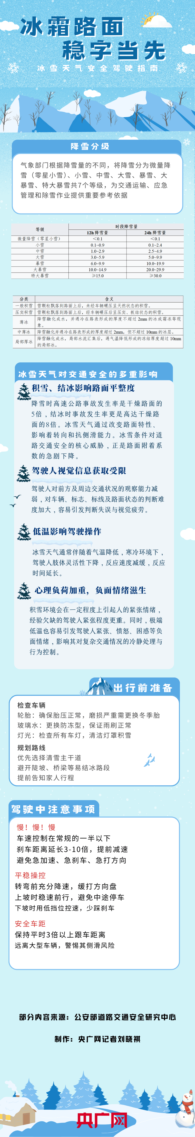 央广网呼和浩特12月12日消息(记者刘晓祺)当路面开始“溜冰”,你的驾驶模式需要一键更新。 冰雪天出行,仅靠小心不够,更需要科学方法。请收好这份《冰雪天气安全驾驶指南》。