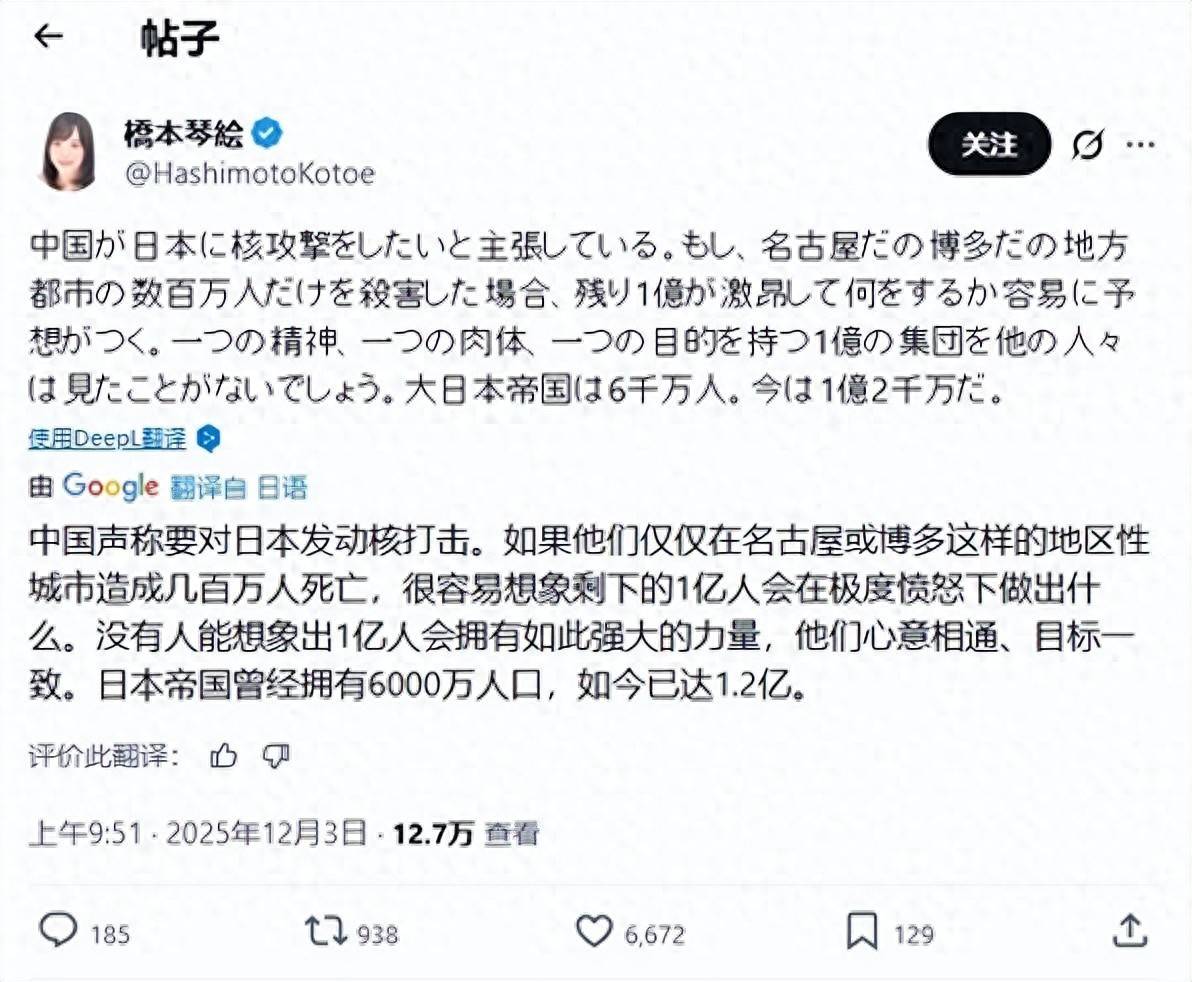 近期,日本右翼桥本琴绘一番玉碎之论引发了中日两国网民的关注,她说:“中国声称要对日本发动核打击,如果他们仅仅在名古屋或博多这样的地区性城市造成几百万人死亡,那么剩下的1亿日本人也会愤怒复仇”。