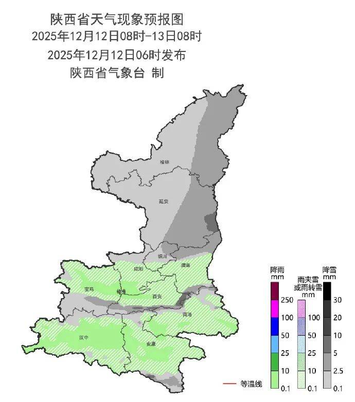 12月11日06时—12日06时全省共有63个区县424个监测站出现降水,最大宁强红石梁3.1毫米;城区最大2.1毫米(未央区辛家庙街办应用);其中陕北大部、关中北部部分、渭南南部山区等地共27个县区出现降雪。