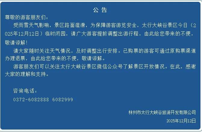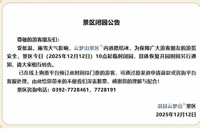 12月12日,记者从郑州索河郊野公园、太行大峡谷、周口恐龙欢乐世界等景区获悉,受降雪天气影响,为充分保障广大游客的人身安全,各景区于今日(12月12日)临时闭园。