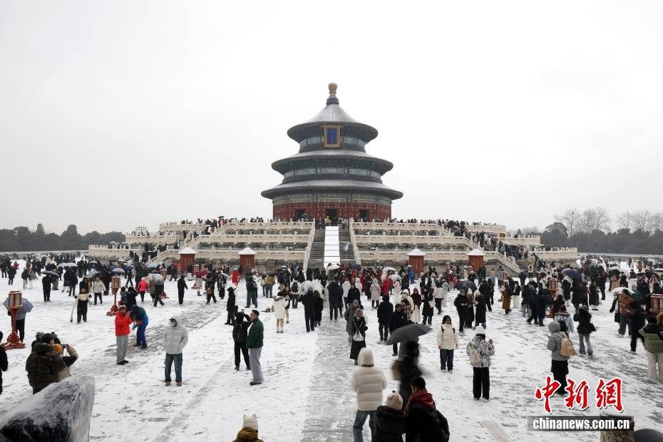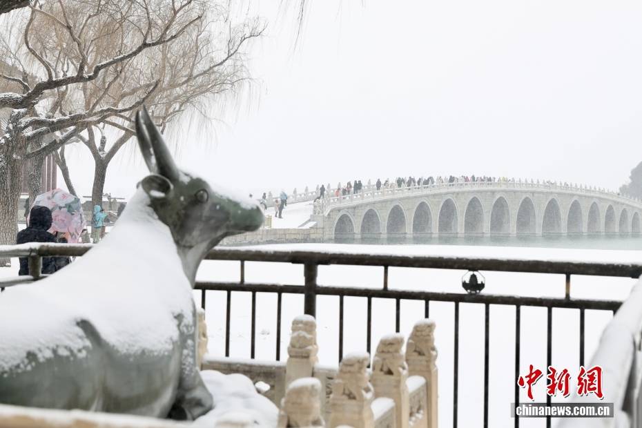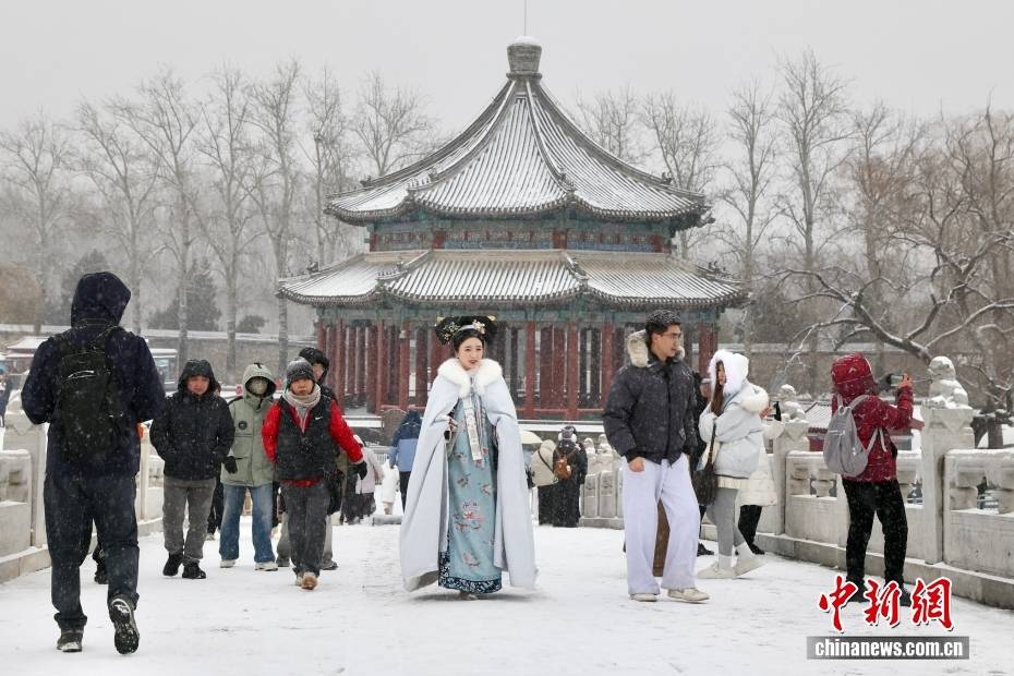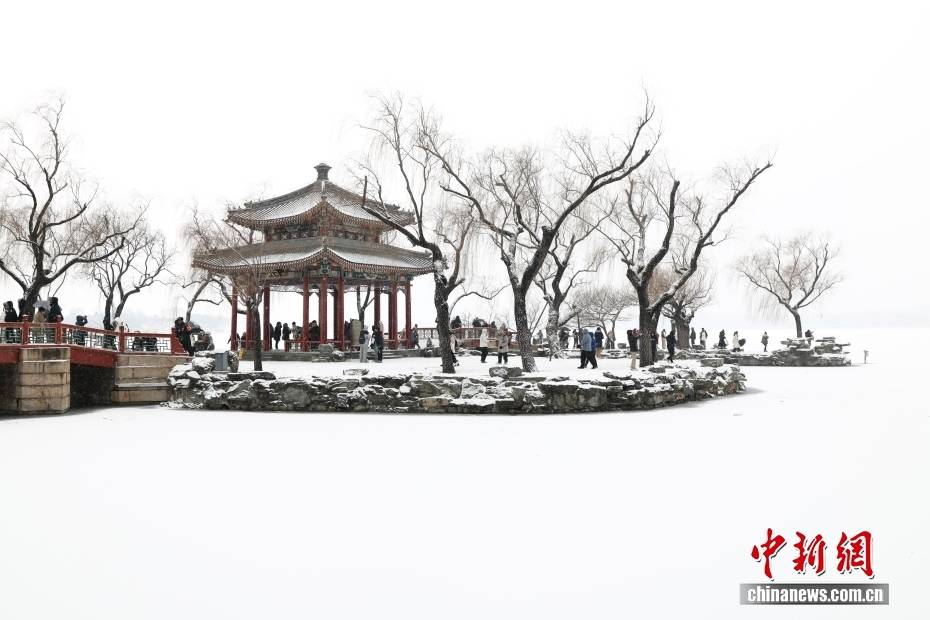 12月12日,北京市迎来2025年入冬以来首场降雪,颐和园银装素裹。图为游客在雪中参观颐和园。中新社记者 易海菲 摄