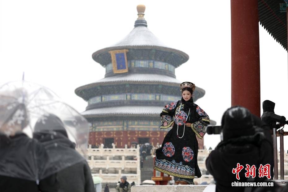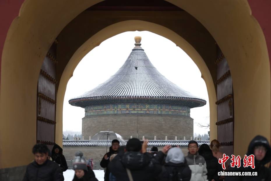 12月12日,北京城区出现明显降雪,市民、游客在北京天坛公园内游览、赏雪。图为游客在天坛公园拍照。中新社记者 富田 摄