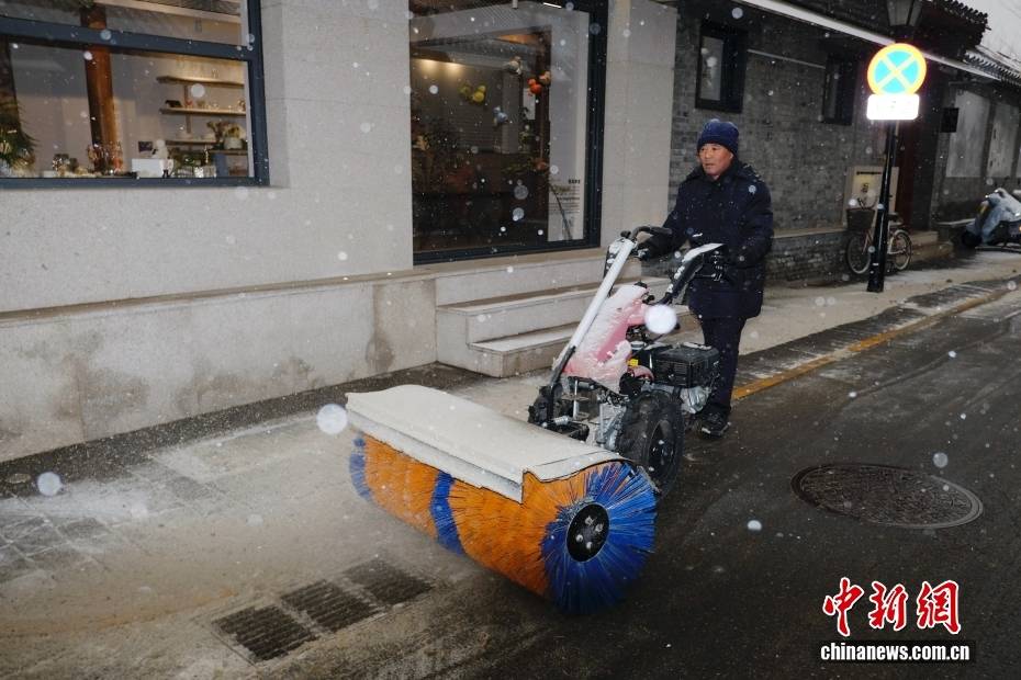 12月12日,北京城区出现明显降雪,工作人员清理国子监街积雪。中新社记者 韩海丹 摄