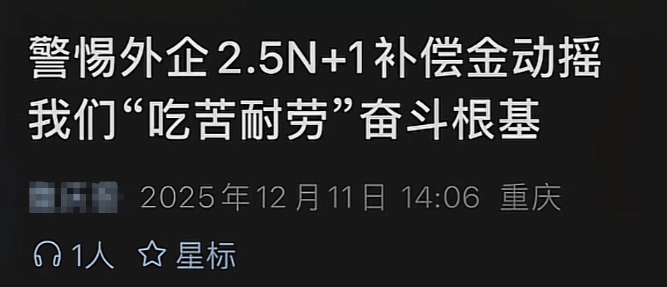 同时,在社交媒体上,“恶意补偿”的梗再次热传,也有网友发文称,要“警惕外企2.5N+1补偿金动摇我们‘吃苦耐劳’奋斗根基”,疑似反讽国内某些企业的违法裁员乱象。