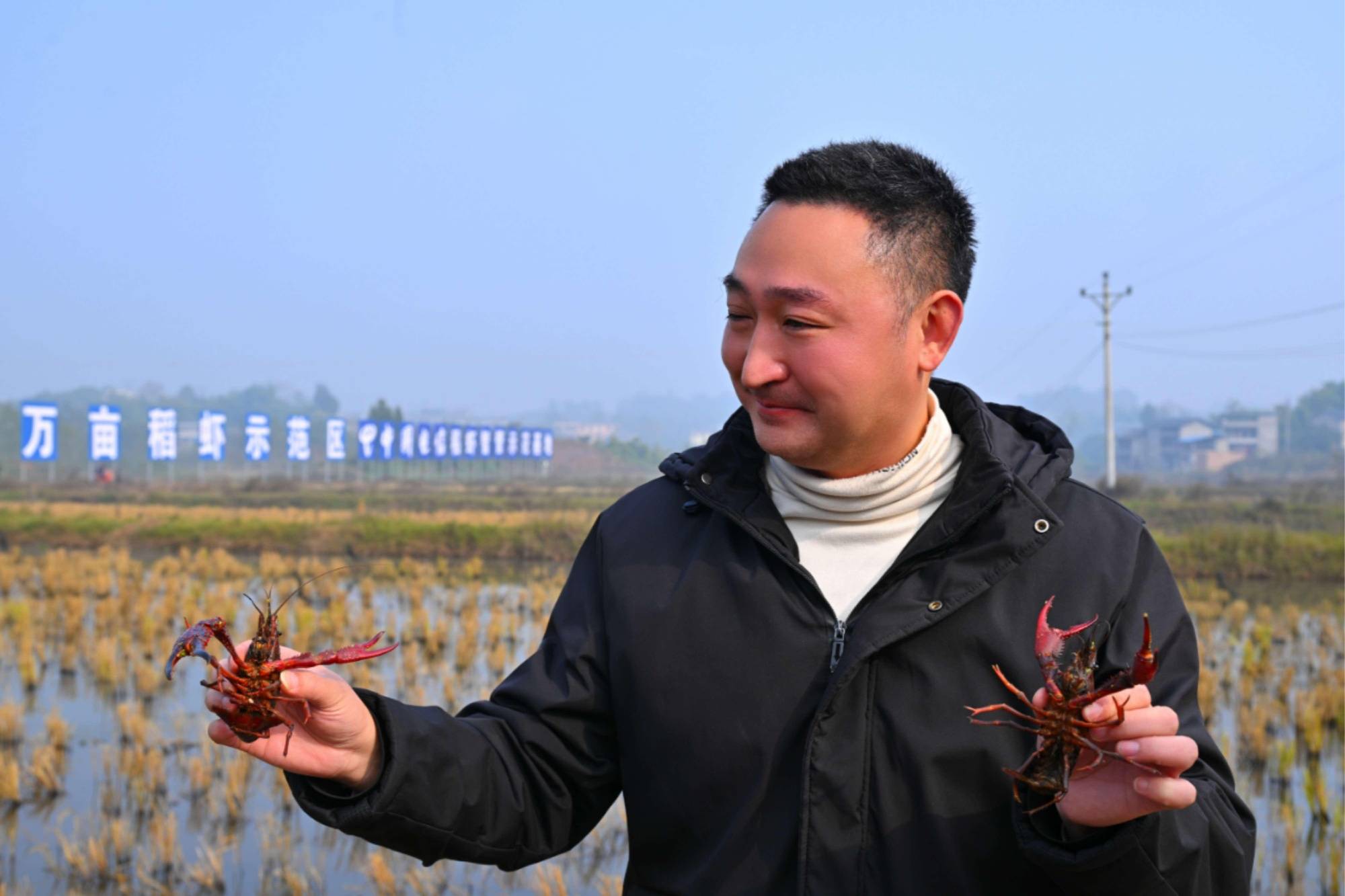 贺小波展示养殖的小龙虾(央广网发 重庆电信供图)