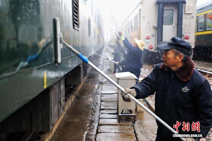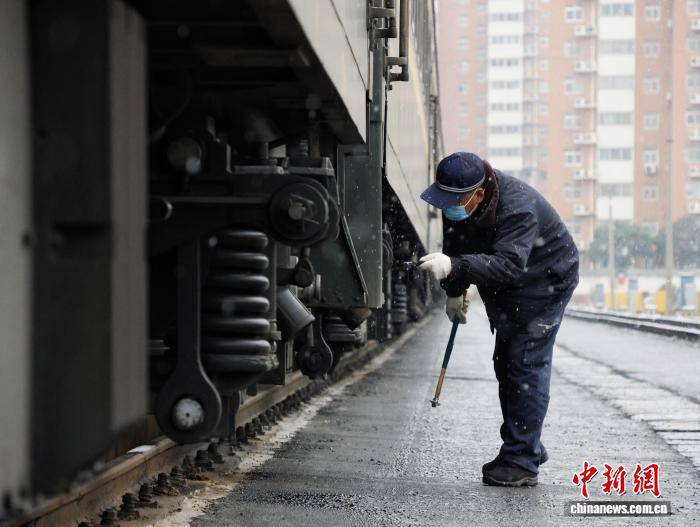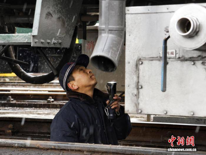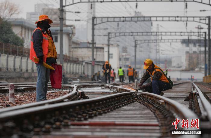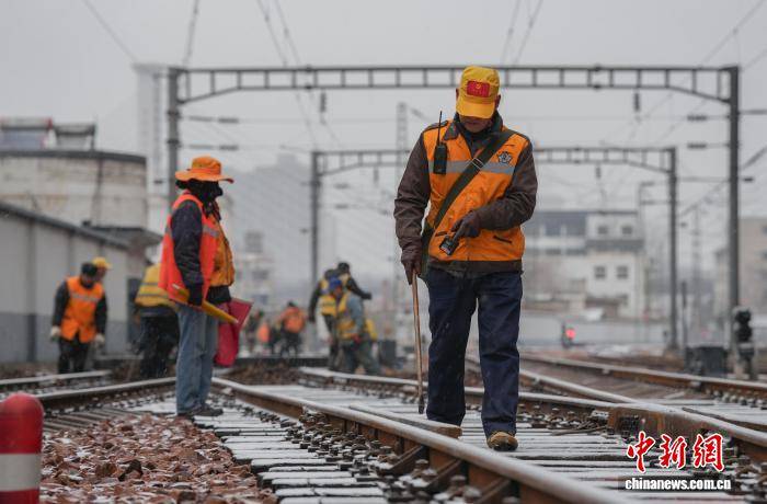 12月12日,国铁集团郑州局管内迎来今年首场大范围降雪。郑州局工作人员在雪中对铁路线进行清扫和防护,并通过科技手段实时监测线路状况,快速清除积雪,确保列车安全平稳运行。图为工作人员雪天为铁路护航。 国铁集团郑州局 供图