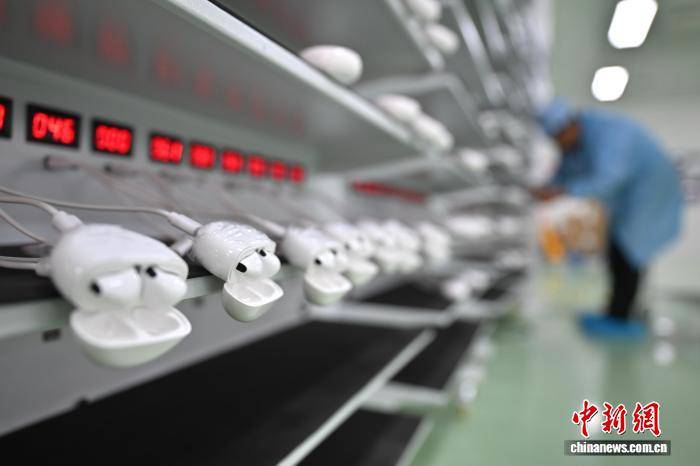 临近年终,河南商丘梁园区商丘集美数智产业园,工人在蓝牙耳机生产线上赶制出口海外的订单。图为12月11日工人准备为组装完成的耳机充电。 李恒 摄