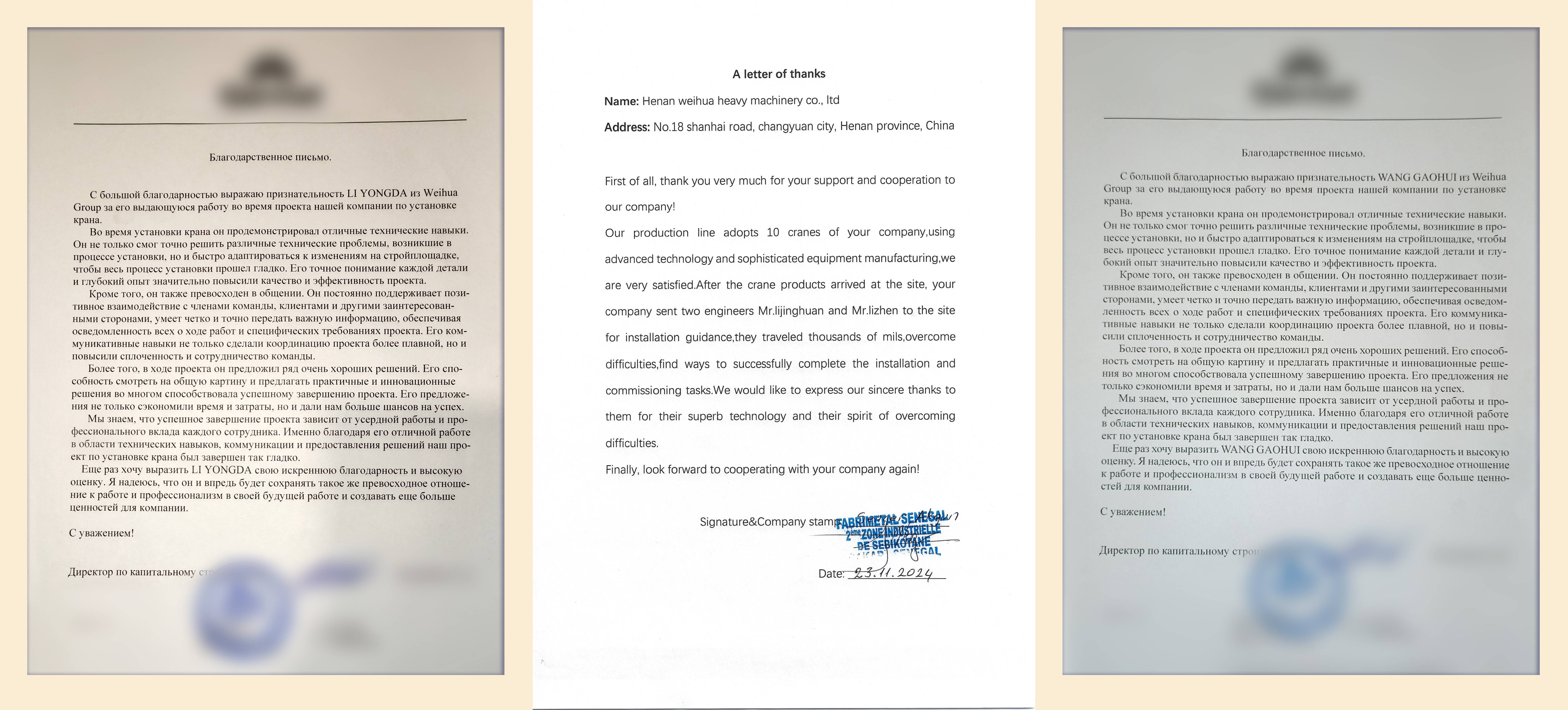 大河网讯 “我们对贵公司提供的10台起重机非常满意。同时,中国工程师千里迢迢来到哈萨克斯坦,克服重重困难,圆满完成安装调试任务。我们向他们不畏困难的精神表示诚挚的感谢。”近日,在卫华集团研究院及高端装备中试基地项目部,记者见到了一封来自哈萨克斯坦的感谢信,字里行间流露出外国人对“中国制造”的认可和对中国工程师的敬意。