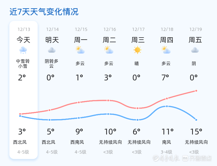 今天是2025年12月13日,星期六,农历十月廿四。威海市迎来大雪天气,气温在2℃到3℃之间。各区普遍出现中雪转小雪的天气状况,西北风1级,空气湿度高达95%,PM2.5指数仅为19,空气质量优良。市民朋友们请注意保暖,出行时注意安全。
