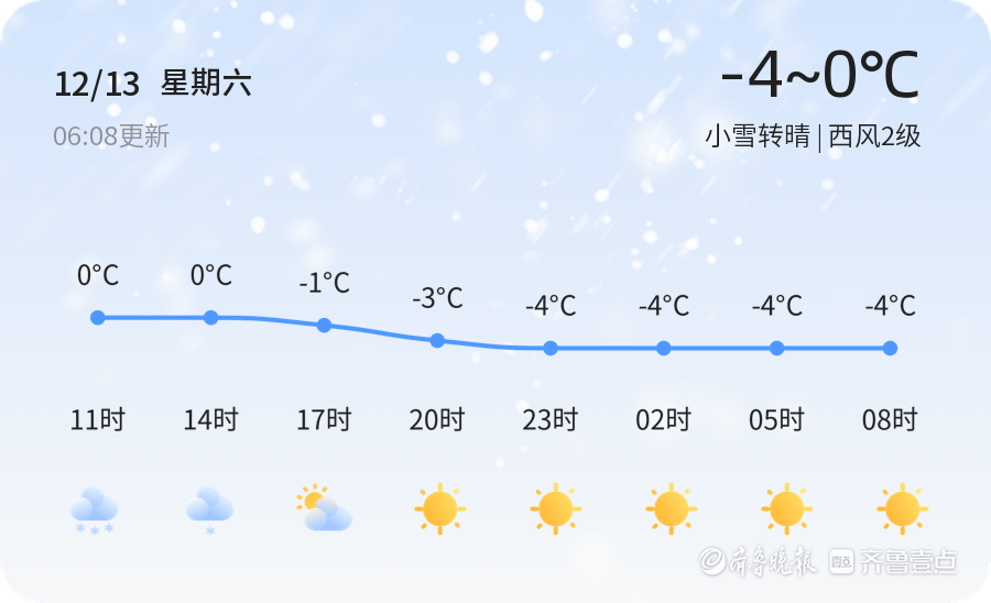 今天是12月13日,星期六,农历十月廿四。滨州迎来小雪天气,气温在-4℃至0℃之间,西风2级,空气湿度为89%。空气质量指数为42,属于优级,对人体健康无影响。今日气温较低,市民出行请注意防寒保暖,驾车时请保持车距,确保行车安全。