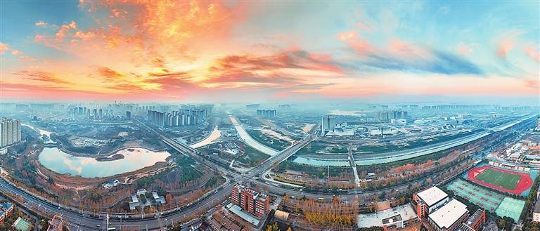 南水北调中线工程郑州段(右)与贾鲁河交相辉映(12月6日摄)。 杨其格 摄