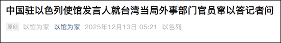 中国驻以色列大使馆微信公众号“以馆为家”12月13日消息,中国驻以色列大使馆发言人就台湾当局外事部门官员窜以答记者问。全文如下: