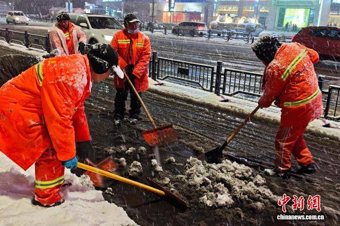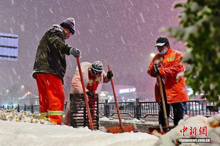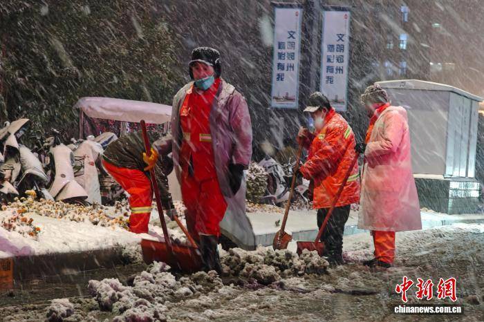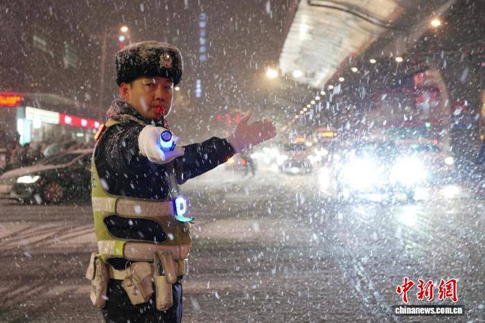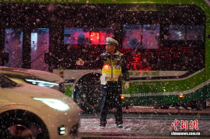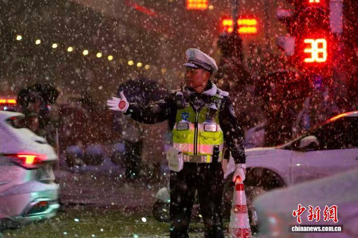 12月12日,河南郑州迎来今冬首场中到大雪,城管、交警等部门启动应急预案,全力保障市民出行安全顺畅。图为交警在雪中执勤。中新社记者 李超庆 摄