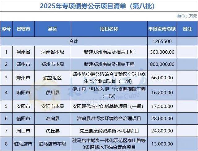 本次公示涉及评审通过项目8个,包括新建郑州南站及相关工程、郑州航空港经济综合实验区全球电商生态产业园项目(一期)等,申报发债总额为126.55亿元。