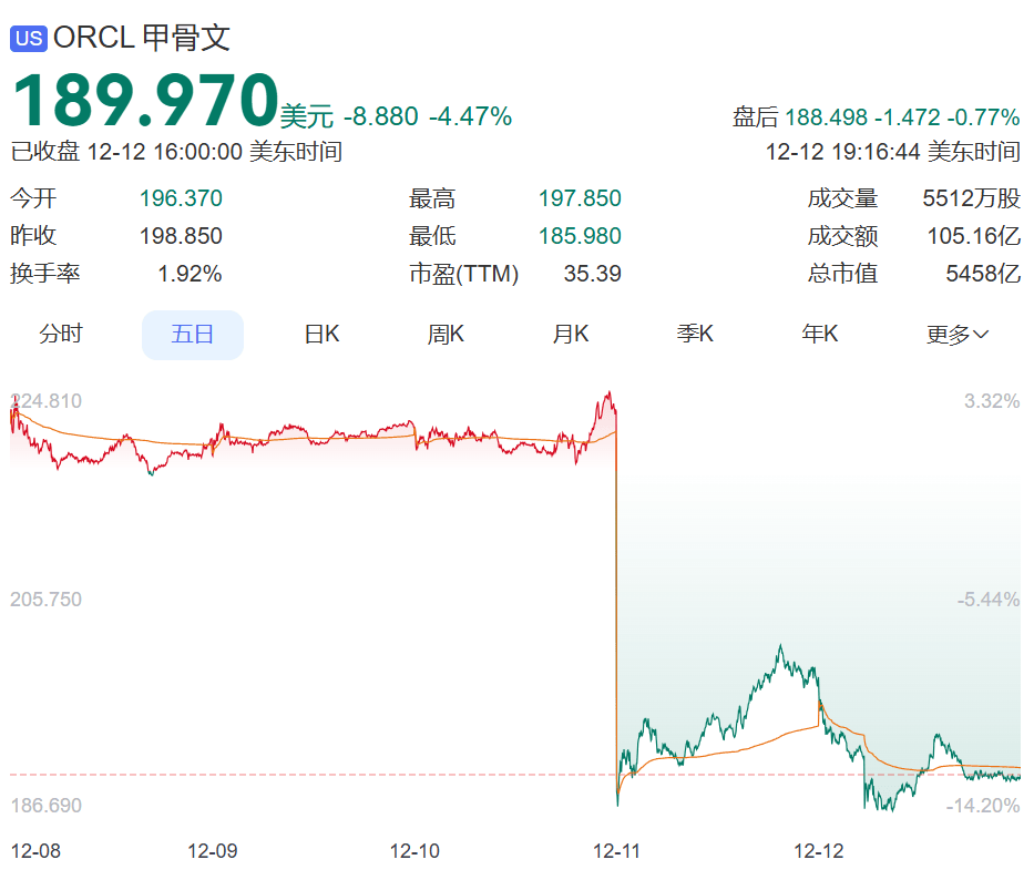 继11日暴跌超10%后,甲骨文12日再跌超4%。当地时间12月12日,甲骨文传出的数据中心延期消息令AI概念股雪上加霜,投资者对人工智能(AI)领域泡沫的疑虑加剧。知情人士消息称,甲骨文已将部分为OpenAI开发的数据中心竣工日期从2027年推迟至2028年。延期主要是由于劳动力和材料短缺。今年夏季,甲骨文曾与OpenAI签署一份高达3000亿美元的算力供应协议,负责为后者模型训练与推理提供基础设施。