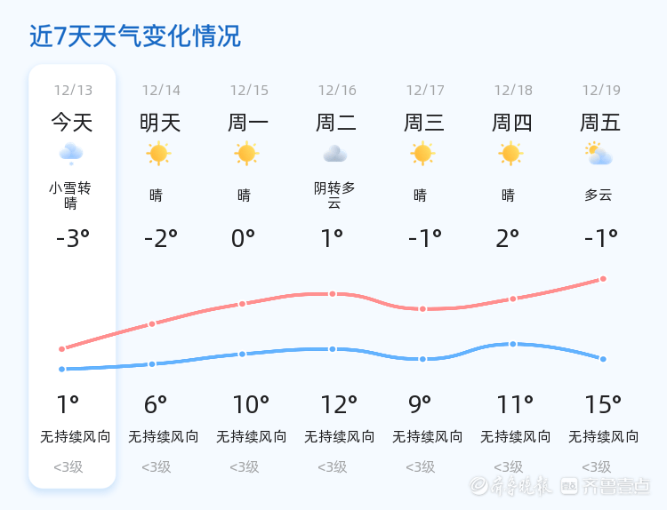 今天是12月13日,星期六,农历十月廿四。临沂市迎来小雪转晴的天气,气温在-3°C至1°C之间波动,整体天气寒冷。各区均出现小雪天气,风力较小,西南风1级,空气湿度较高,达到94%,PM2.5指数为63,空气质量良好。市民出行需注意防寒保暖,谨防道路湿滑。