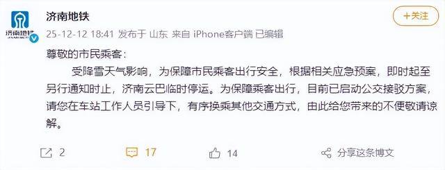 昨天(12日),济南地铁发布公告:受降雪天气影响,为保障市民乘客出行安全,根据相关应急预案,即时起至另行通知时止,济南云巴临时停运。为保障乘客出行,目前已启动公交接驳方案,请您在车站工作人员引导下,有序换乘其他交通方式,由此给您带来的不便敬请谅解。