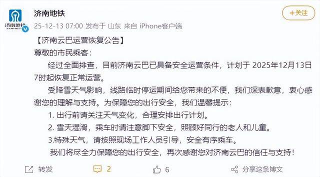 今(13日)早7:00,济南轨道交通集团官方微博发布济南云巴运营恢复公告:
