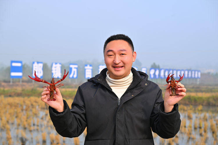 贺小波向记者展示养殖的小龙虾。重庆电信供图
