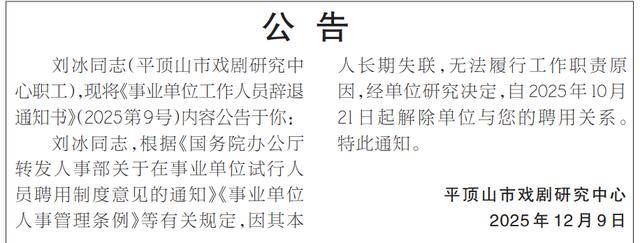 河南平顶山市戏剧研究中心12月9日在《平顶山日报》发布辞退公告。被辞退对象为平顶山市戏剧研究中心职工刘冰同志。