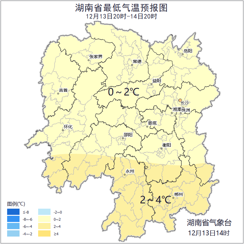 12月14日白天,全省晴天间多云,14日清晨湘北局地有雾;北风2~3级;最低气温0~4℃;最高气温12~16℃。