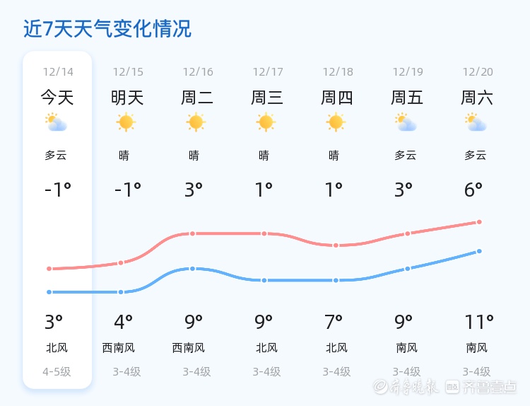 今天是12月14日,星期日,农历十月廿五。青岛市今日天气多云转晴,早晨气温较低,最低气温为-1℃,白天最高气温为3℃。全市各区天气情况基本一致,西北风3级,空气湿度为64%,PM2.5指数为42,空气质量良好。市民出行时请注意保暖,防范低温带来的不适影响。