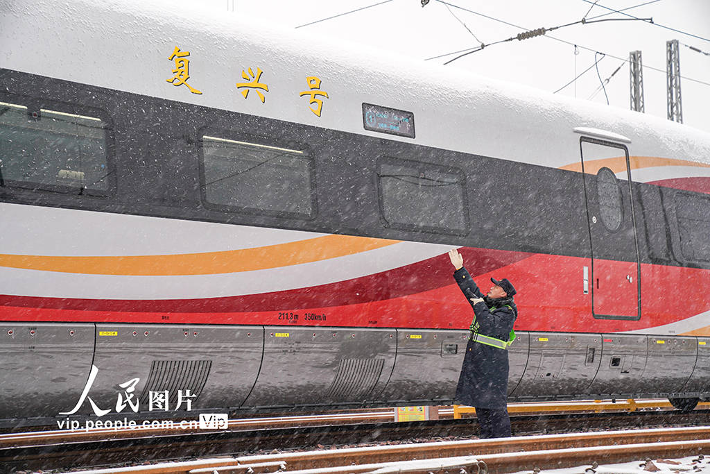 2025年12月12日,河南迎来大范围降雪,中国铁路郑州局集团有限公司郑州动车段立即启动应急预案,迅速响应,从生产组织、应急值守、关键环节管控等方面着手,全力确保动车组安全正点运行。崔轩豪摄(人民图片网)