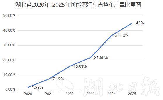 从2020年仅占1.5%,到2025年拿下45%,新能源汽车已在湖北汽车年产量中占据“半壁江山”——如今在这里,每生产两辆车,就有一辆是新能源。