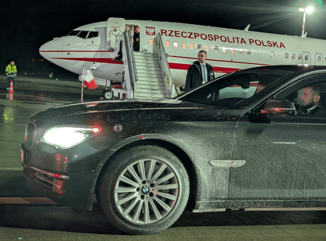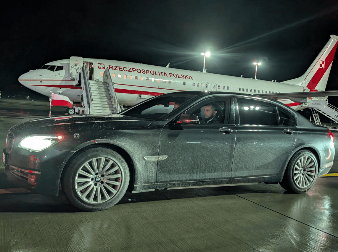 波兰总统纳夫罗茨基抵达拉脱维亚里加机场,接机车辆被拍到“脏兮兮”。图源:波兰媒体