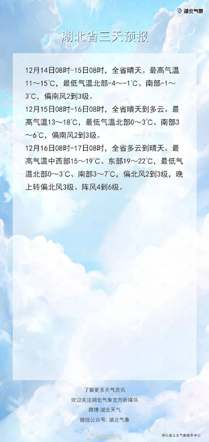 【温馨提示】未来三天全省晴朗升温适宜晾晒,但明天(12月15日)早上,部分地区低温仍在冰点以下,老年人可待气温上升后再进行晨练或户外活动。此外早上部分地区可能有雾,请大家留意当地的预警预报信息,行车遭遇大雾时要及时开启雾灯和双闪,并降低车速,控制车距,必要时靠路边停车,待大雾消散后再上路。