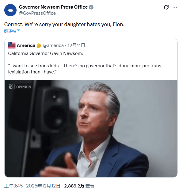 当地时间12月11日,马斯克旗下“美国政治行动委员会”发布一则视频,纽森在视频中表示,他希望看到跨性别儿童,且没有哪位州长比他制定了更多支持跨性别者的立法。纽森办公室12日转发该视频并写道:“没错,很遗憾你女儿恨你,埃隆。”