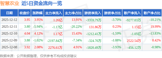 证券之星消息,截至2025年12月12日收盘,智慧农业(000816)报收于3.95元,上涨3.95%,换手率15.72%,成交量225.74万手,成交额9.08亿元。