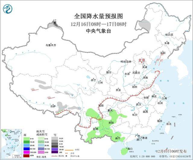 12月16日08时至17日08时,内蒙古东北部、新疆北疆北部、西藏东部和北部等地部分地区有小到中雪或雨夹雪,其中,新疆北疆北部局地有大到暴雪(10~12毫米);西南地区东南部、广西西部和南部、海南岛等地部分地区有小雨。辽东半岛、西藏中北部等地部分地区有5~7级风;巴士海峡、南海东北部和中东部海域有6~7级风、阵风8级。